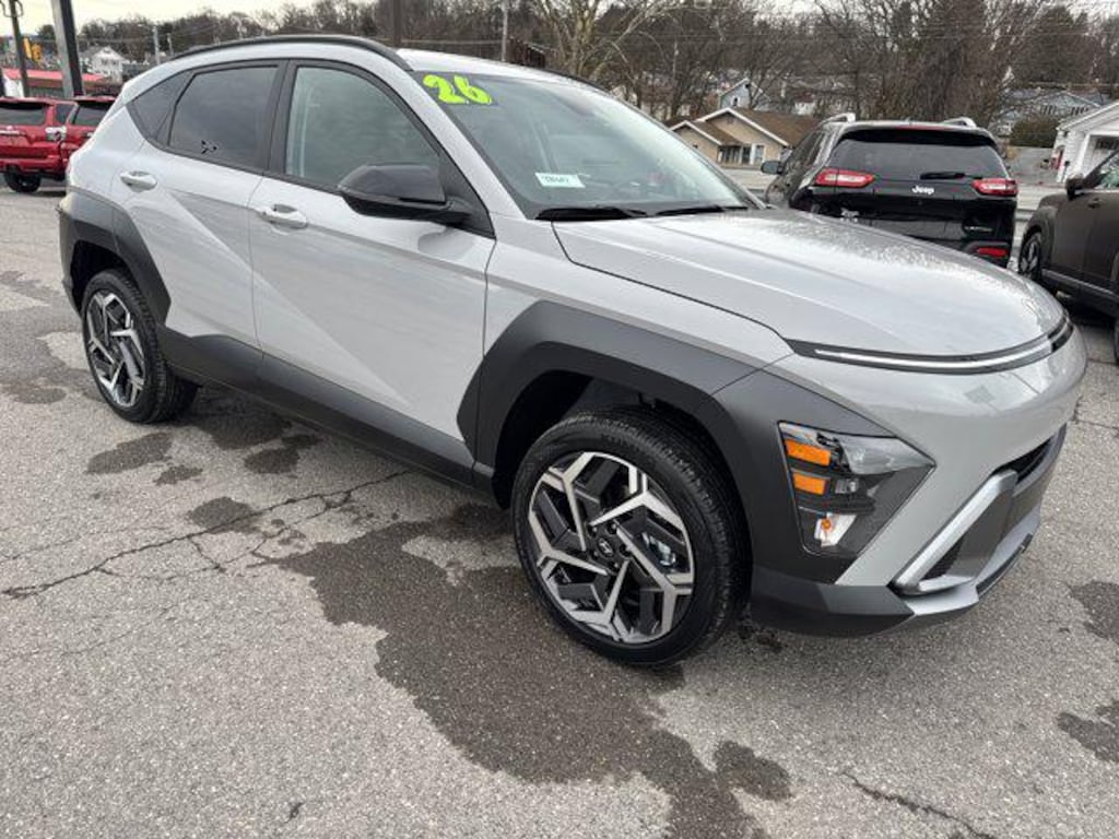 Our 2026 Hyundai Kona SEL Premium AWD in Cyber Gray Metallic delivers smart tech, all-weather capability, and polished design for everyday versatility. Motivated by a 2.0 Liter 4 Cylinder delivering 147hp to a CVT. It's an efficient and energetic combination, helping our All Wheel Drive SUV return nearly 29mpg on the highway. Our Kona elevates its exterior design with LED lighting, bold alloy wheels, black roof rails, matching cladding, and heated power mirrors with built-in turn signals.